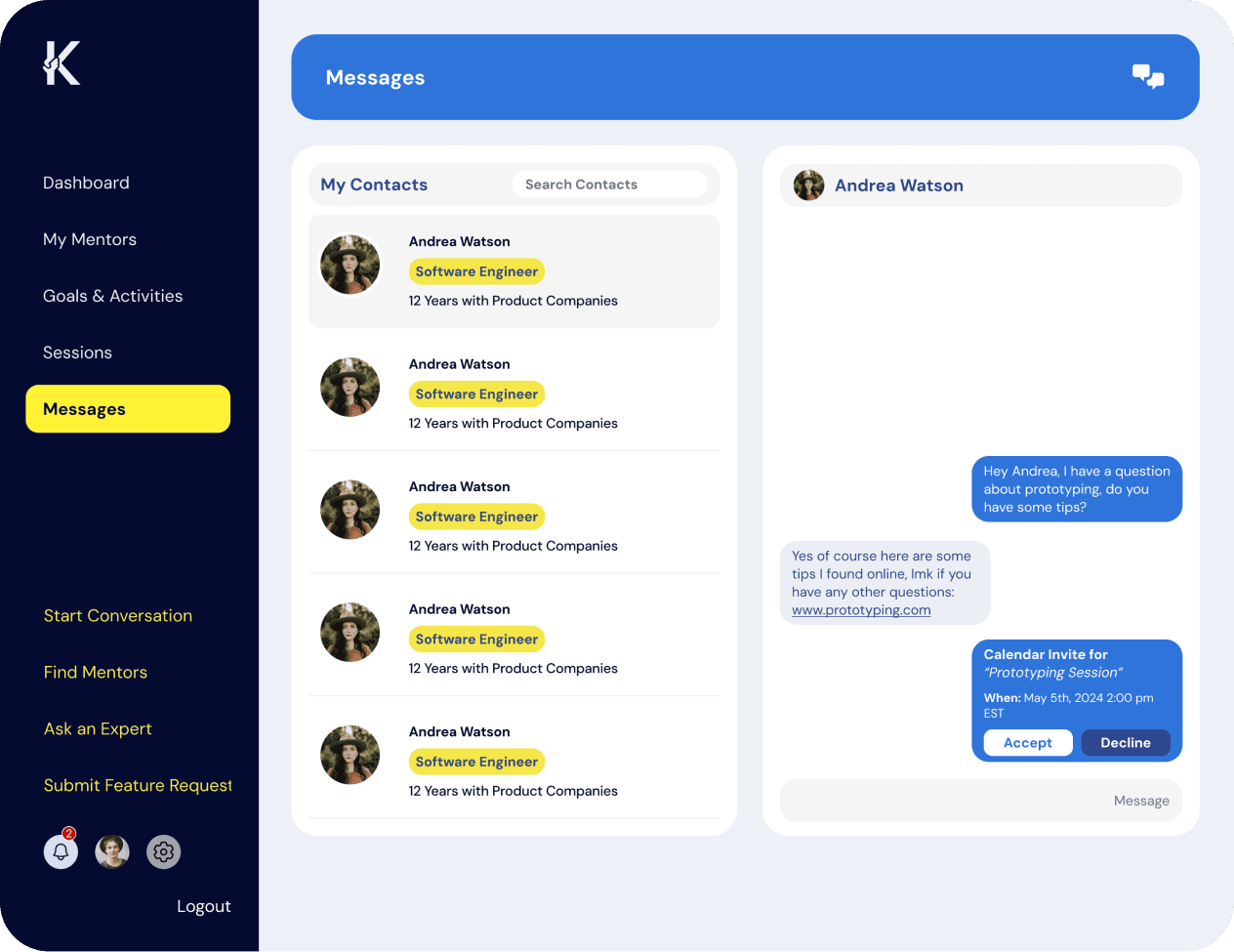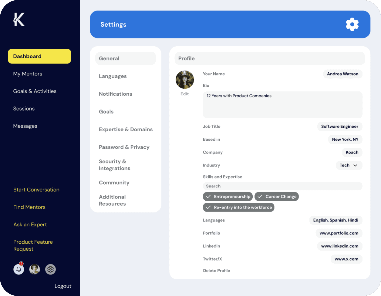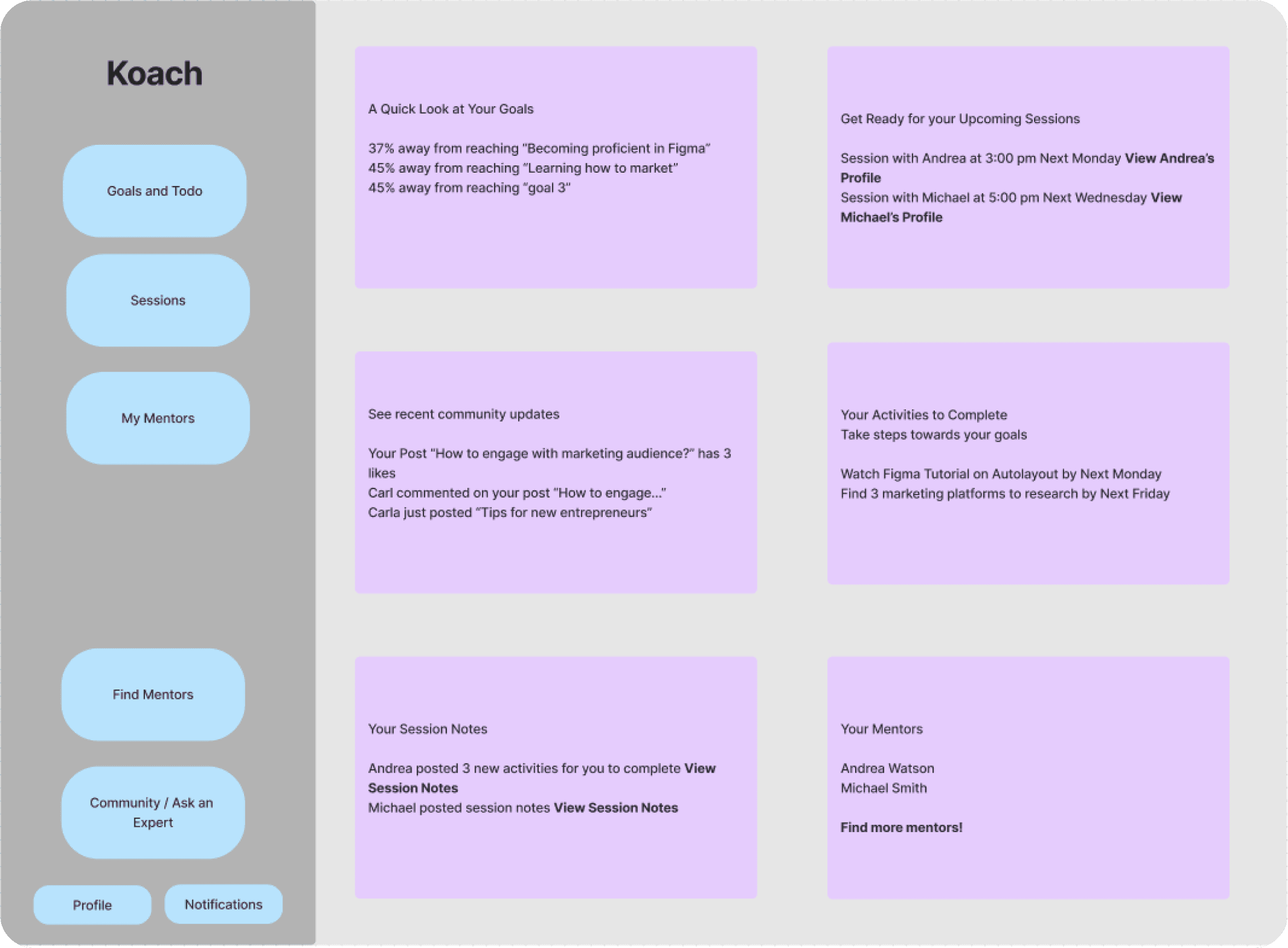 Koach is a small startup in the early-stage. Koach's goals are to provide a platform where students, entrepreneurs and anyone looking to give or gain insights into their career can connect and find mentors and mentees.