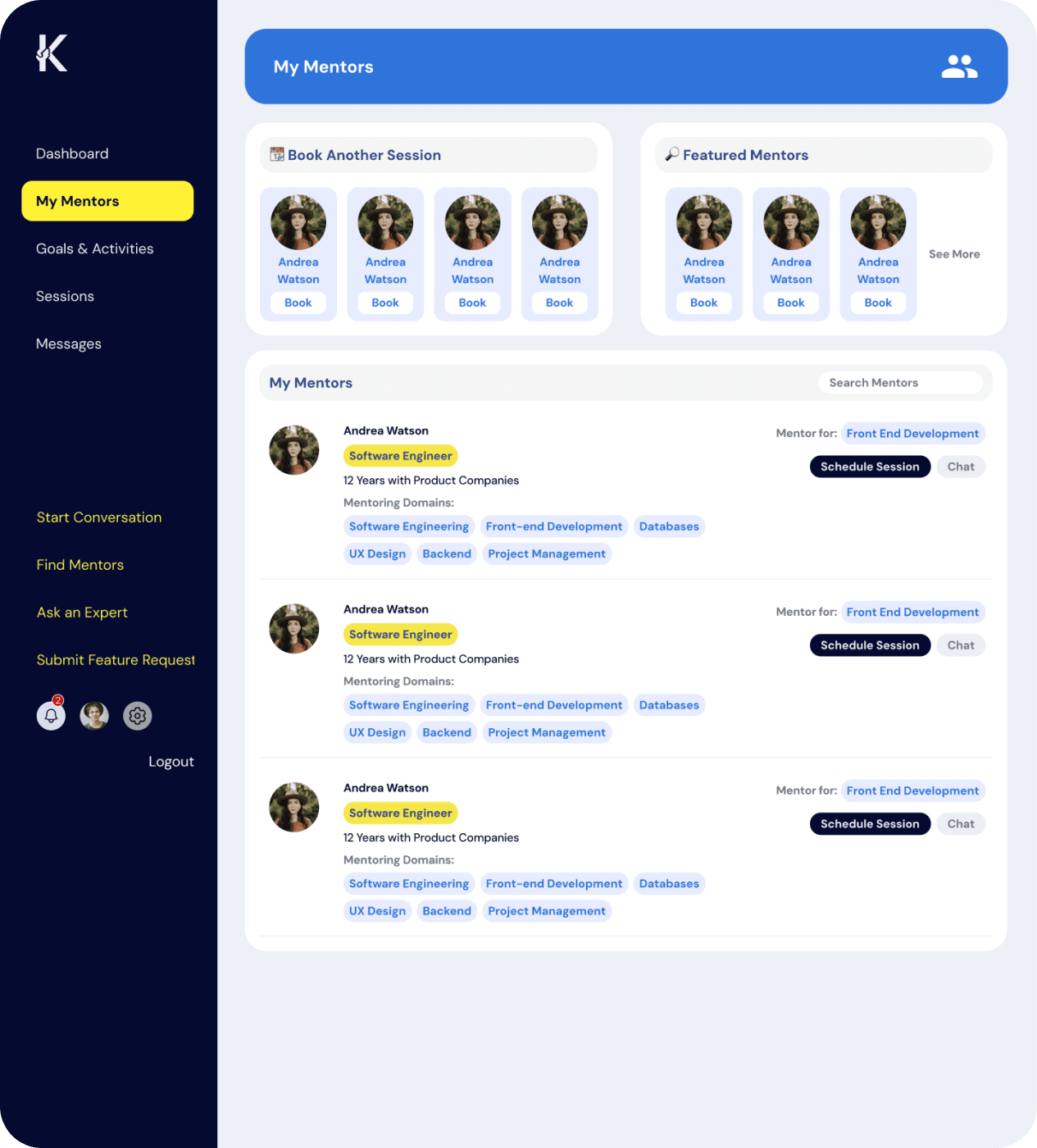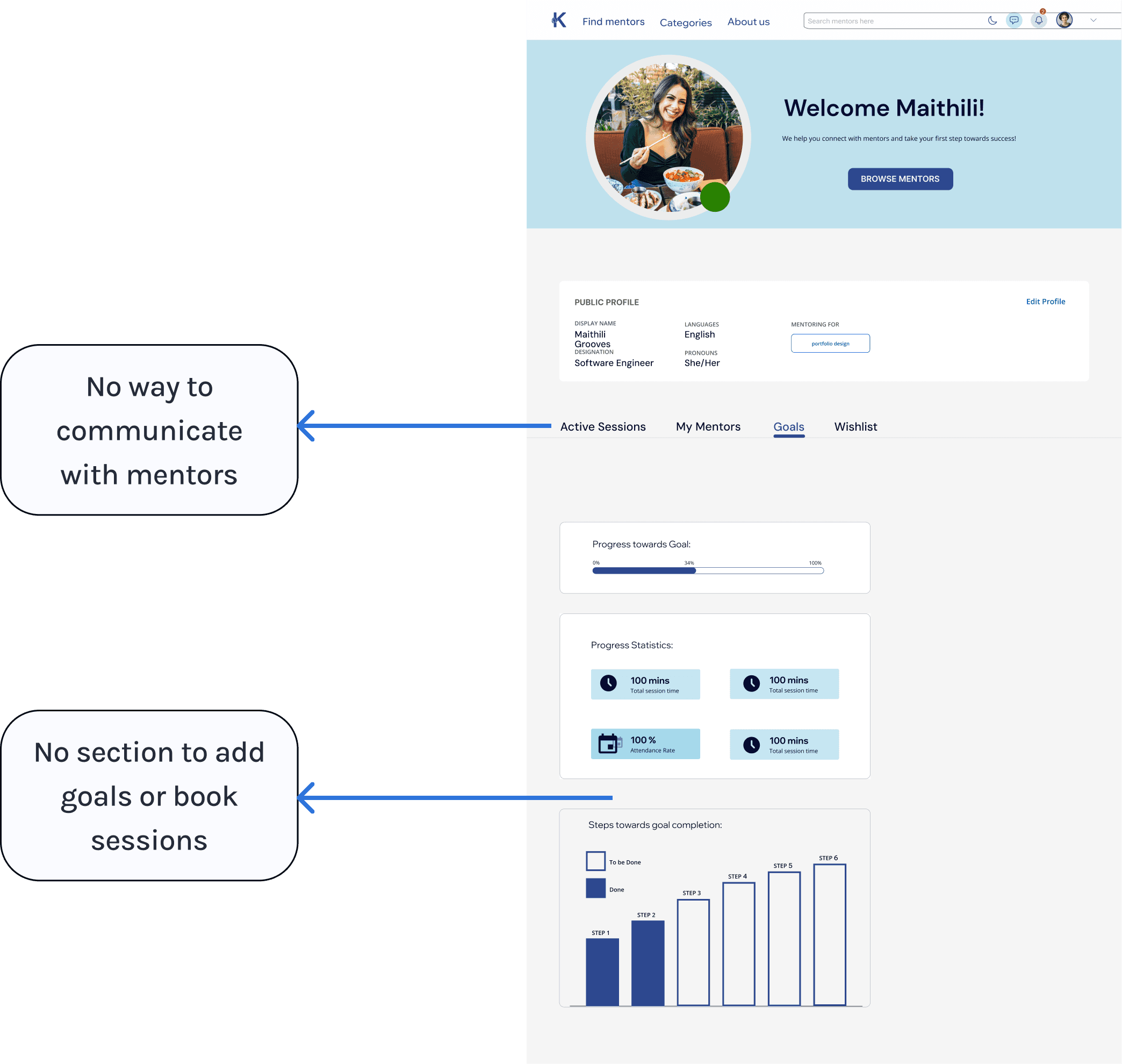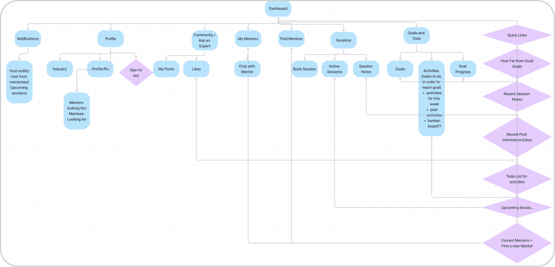 There was a lack of understanding in how the platform should be organized. To visualize how features like ‘booking sessions’ and and ‘communicating with mentors’ would relate to each other, I created an Information Architecture.