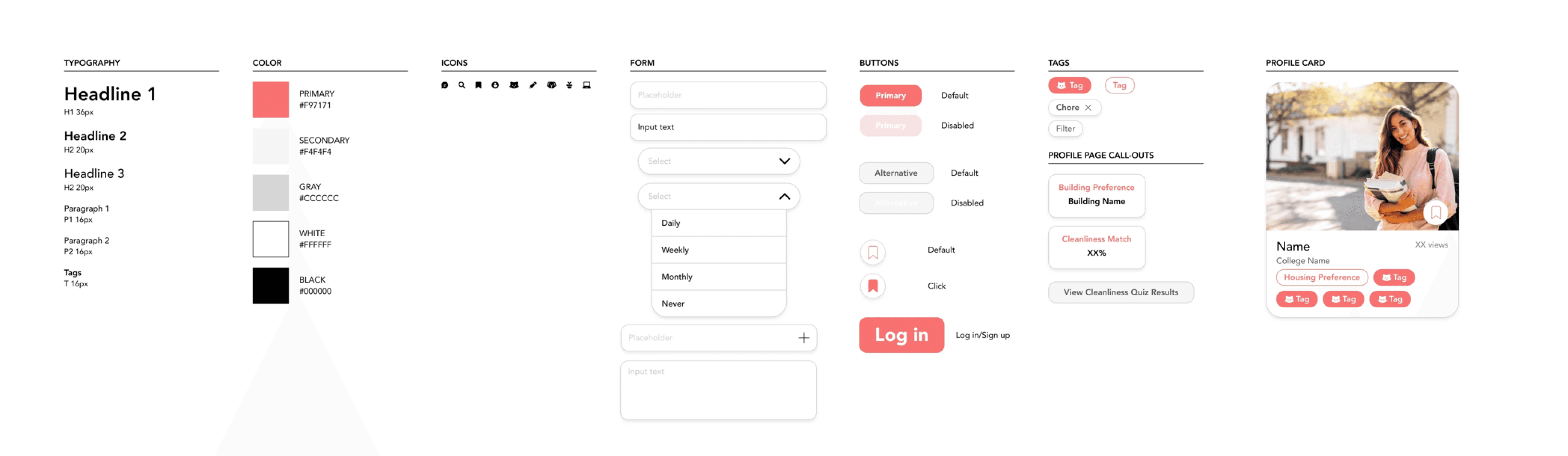 We started by creating low fidelity prototypes of pages from our information architecture. Then we established the design system, such as standardizing button designs, icon set, color palette, and other important components of Uroom. Finally, we incorporated the design system into our prototypes to create the final high fidelity mockups.
