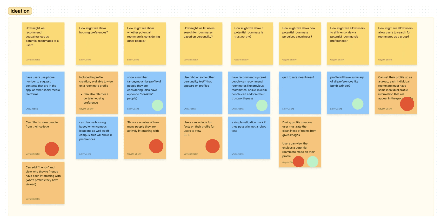 We brainstormed a list of "How Might We" statements to help our brainstorming process for potential features to include in our roommate finding app. We used dot voting to sort through and pick out the most popular feature ideas.