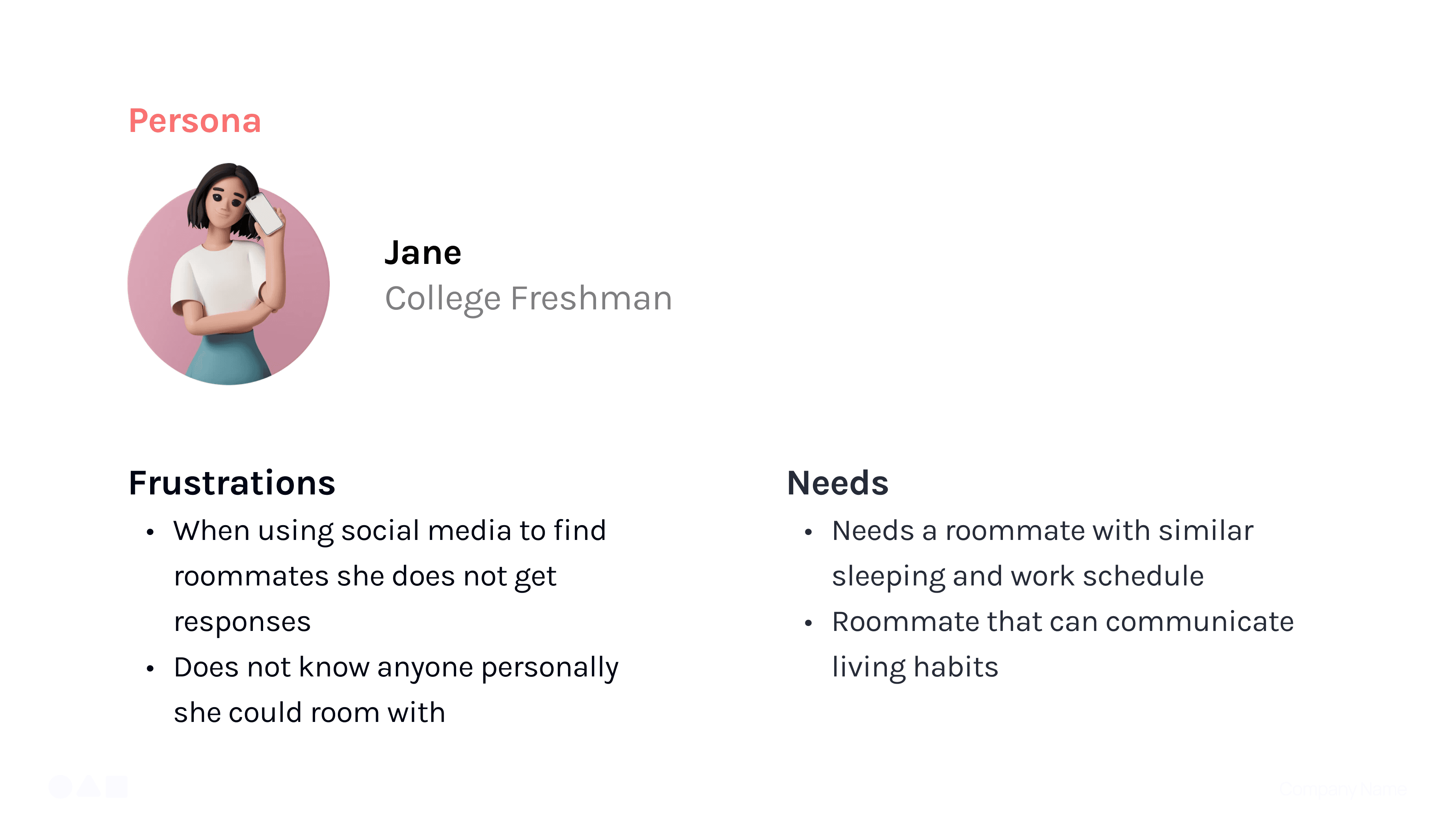 Our goal is to make the roommate-finding process for college students easier by removing the safety risks of using other platforms, and by making it easier to find compatible roommates that match their lifestyle and housing preferences at their university.