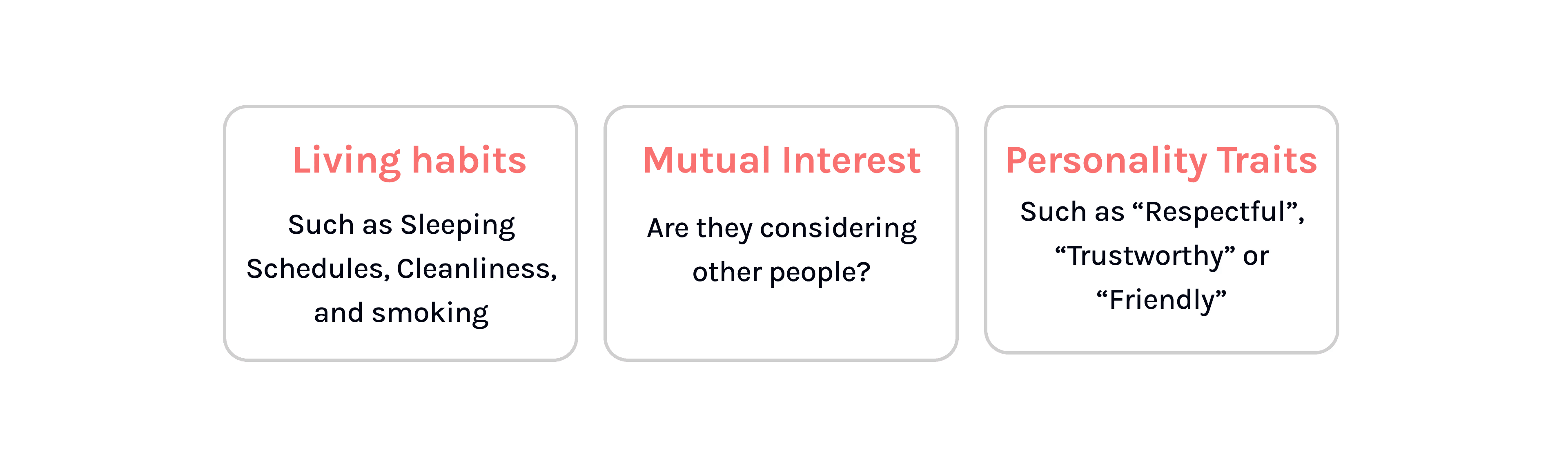 Participants mainly cited living habits (such as sleeping schedules, cleanliness, smoking etc.) and personality traits (like respectful, and friendly) as important factors in choosing a roommate