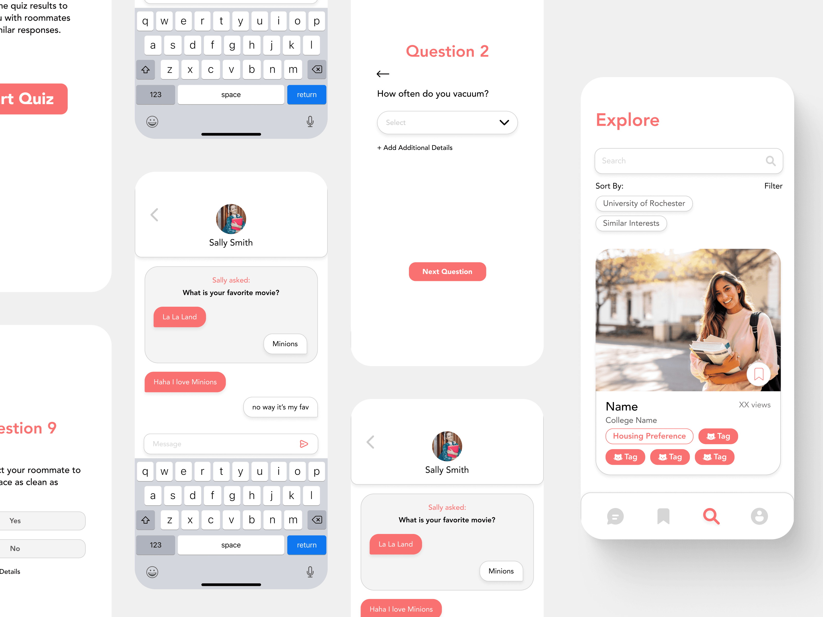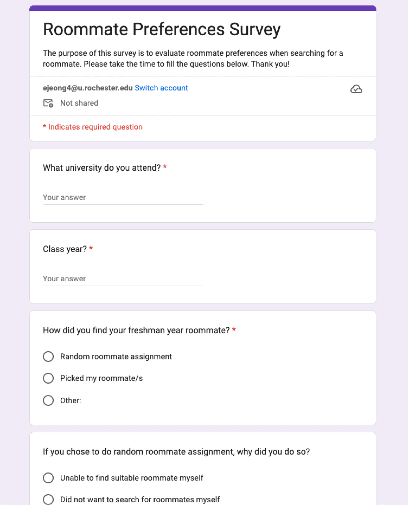 We conducted surveys and interviews to see how students are currently finding roommates, what students look for in a roommate, and frustrations they have with their roommate search.