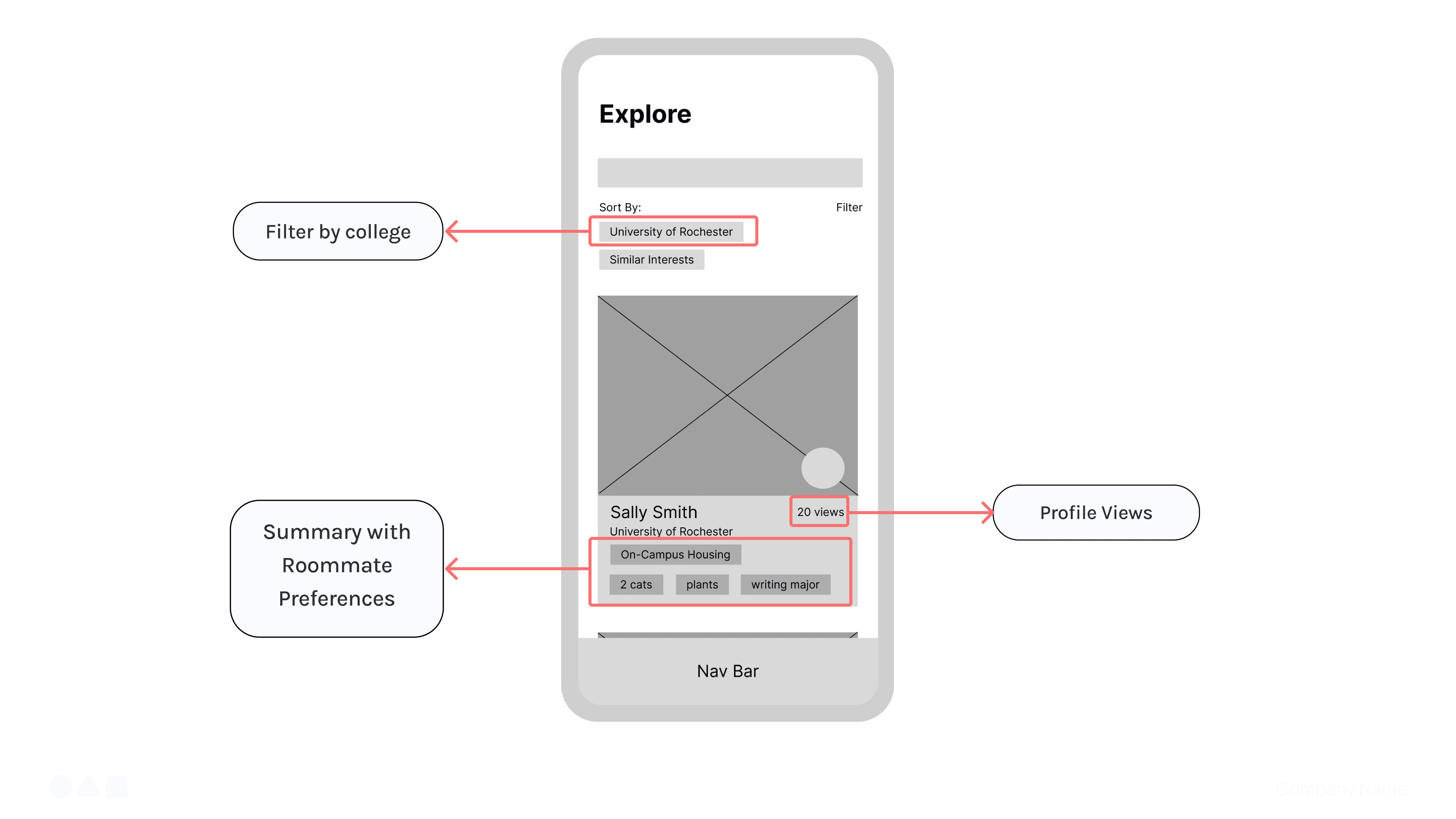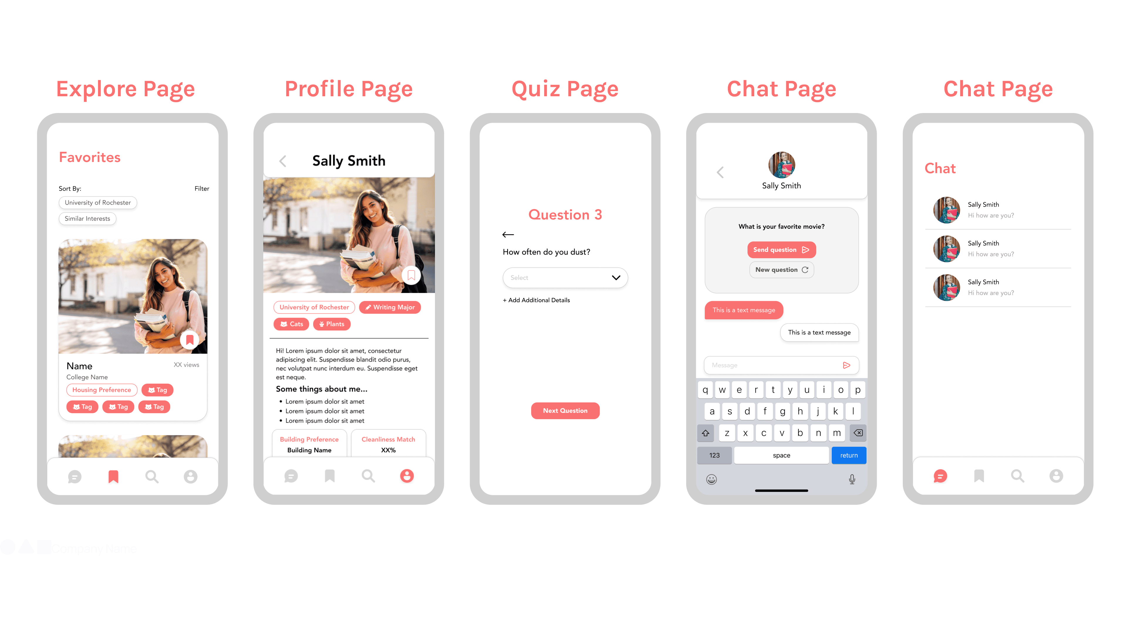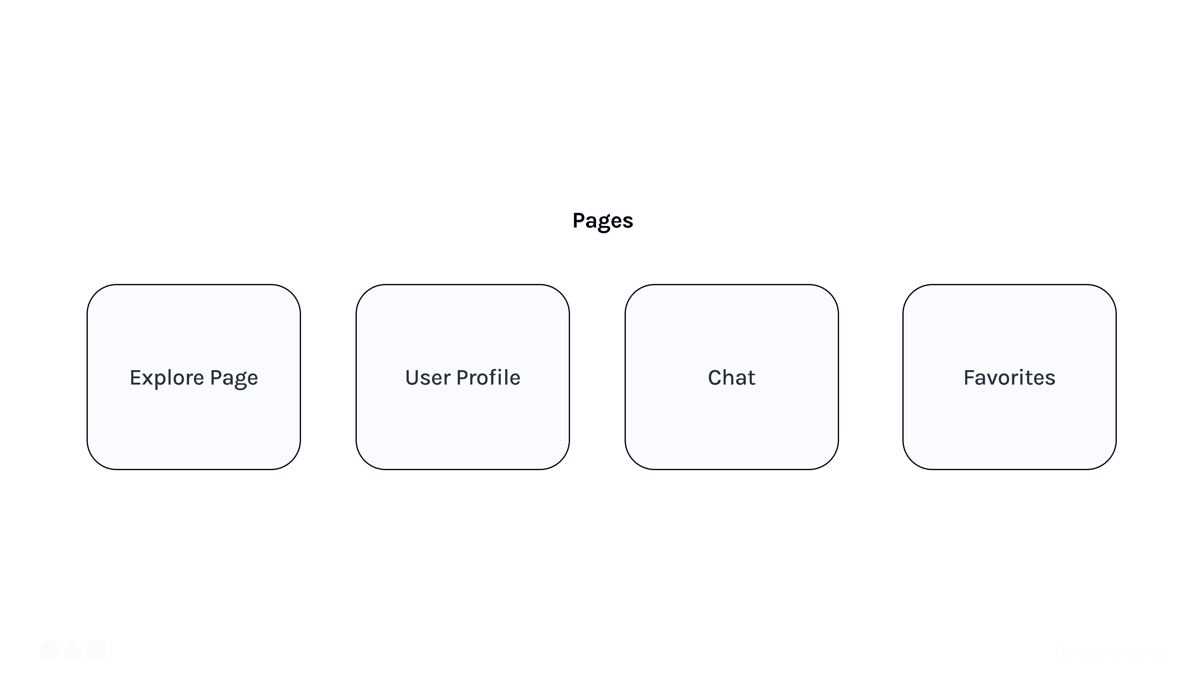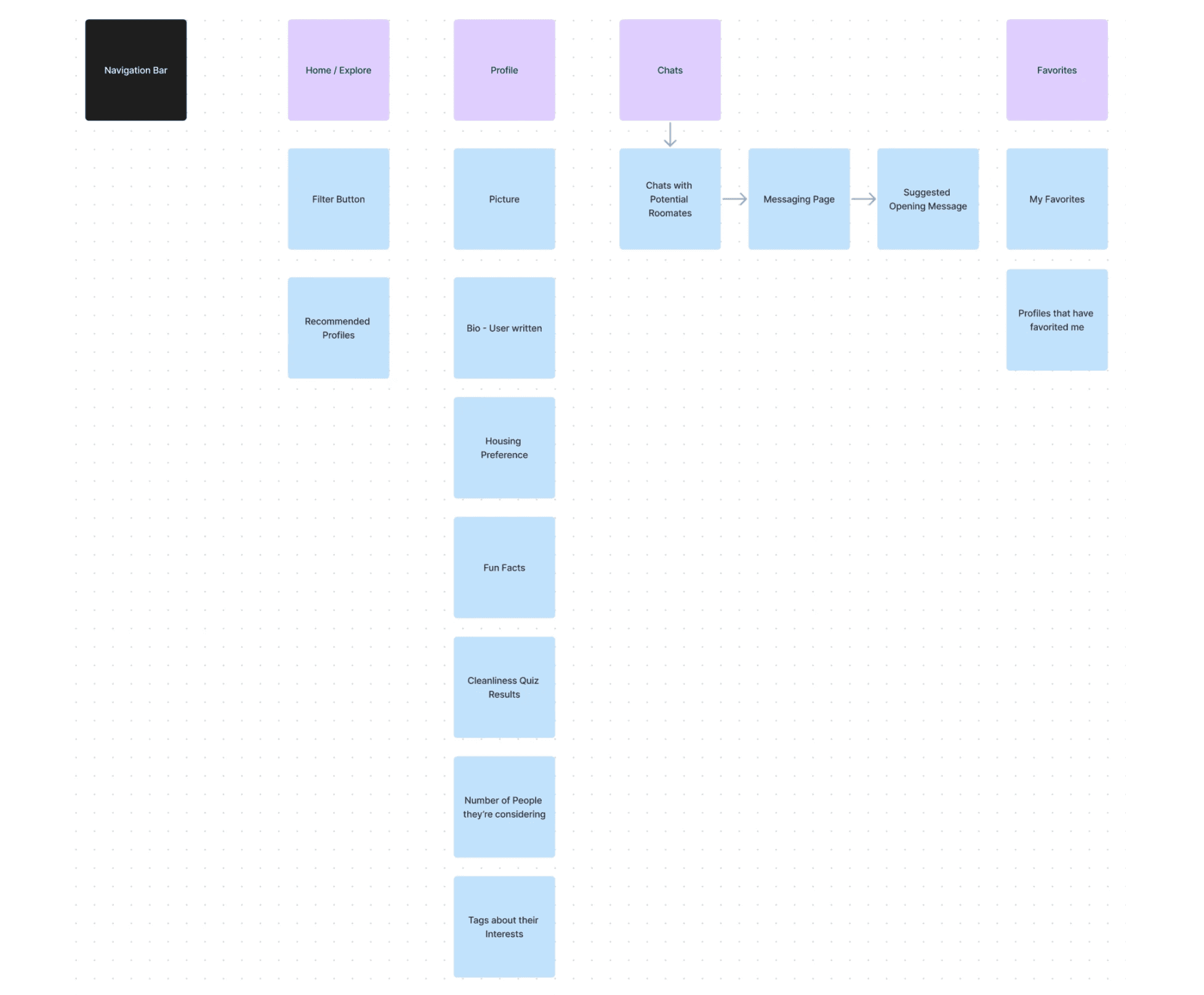 Using our brainstormed features, we mapped out the information architecture of the roommate finding app. This included the Explore page, that included a filtering button for profiles, and a list of recommended profiles for the user, a profile page where users can showcase their housing preferences and information, a chat page for chatting with potential roommates, and a favorites page for liked profiles.
