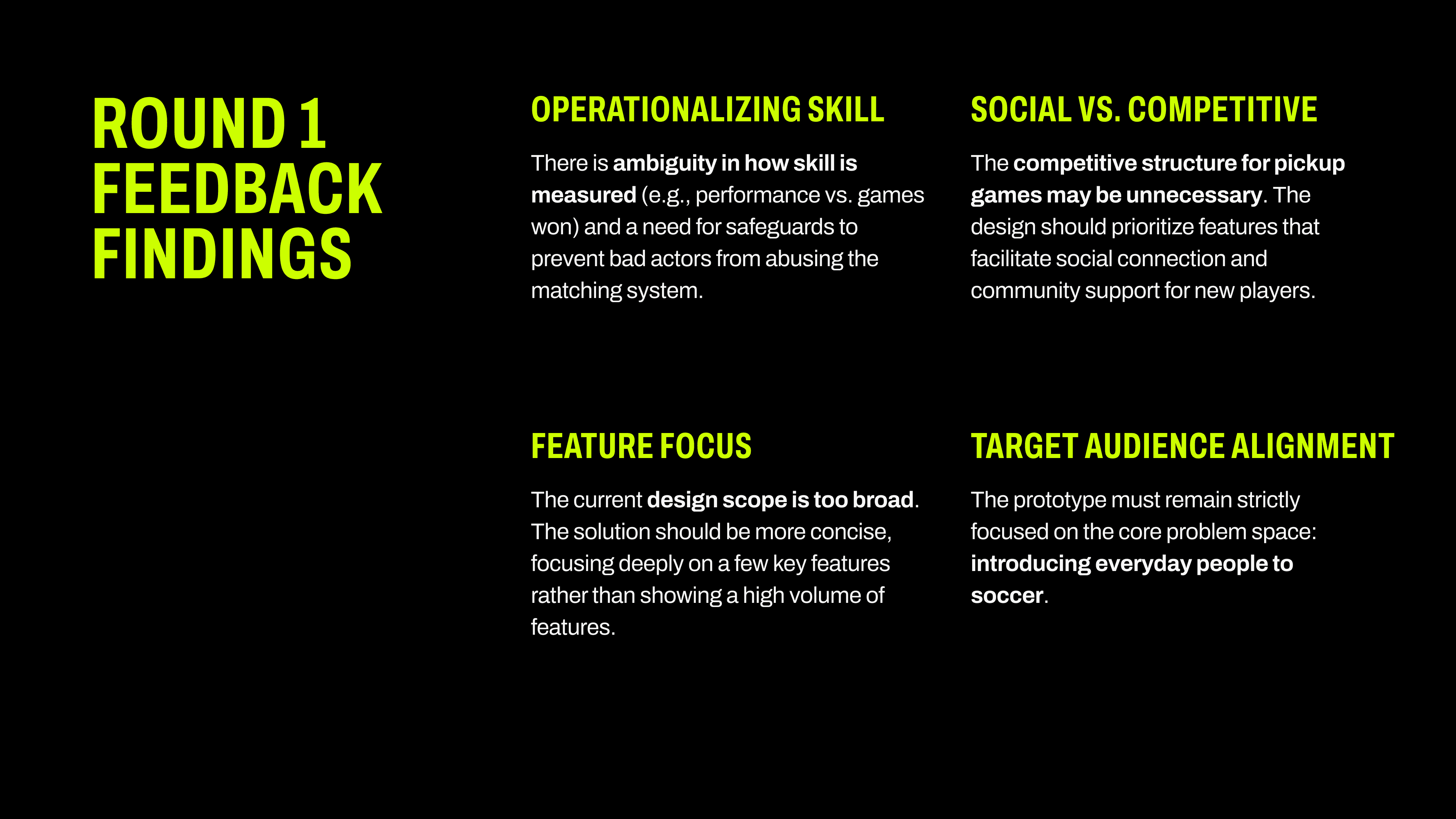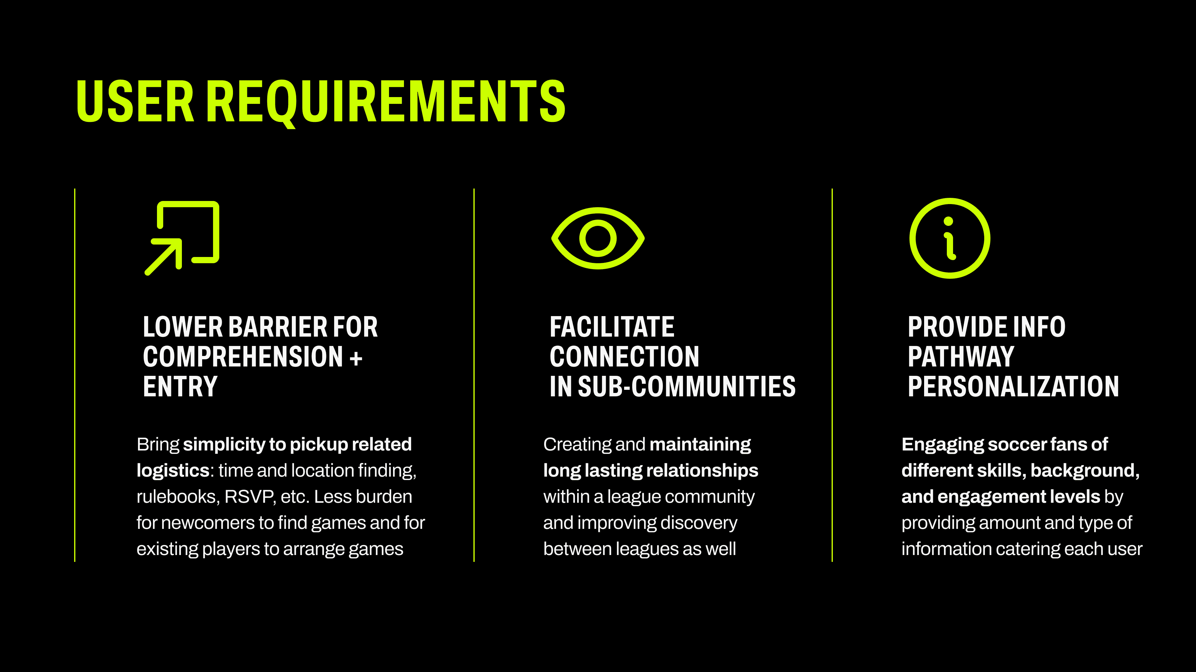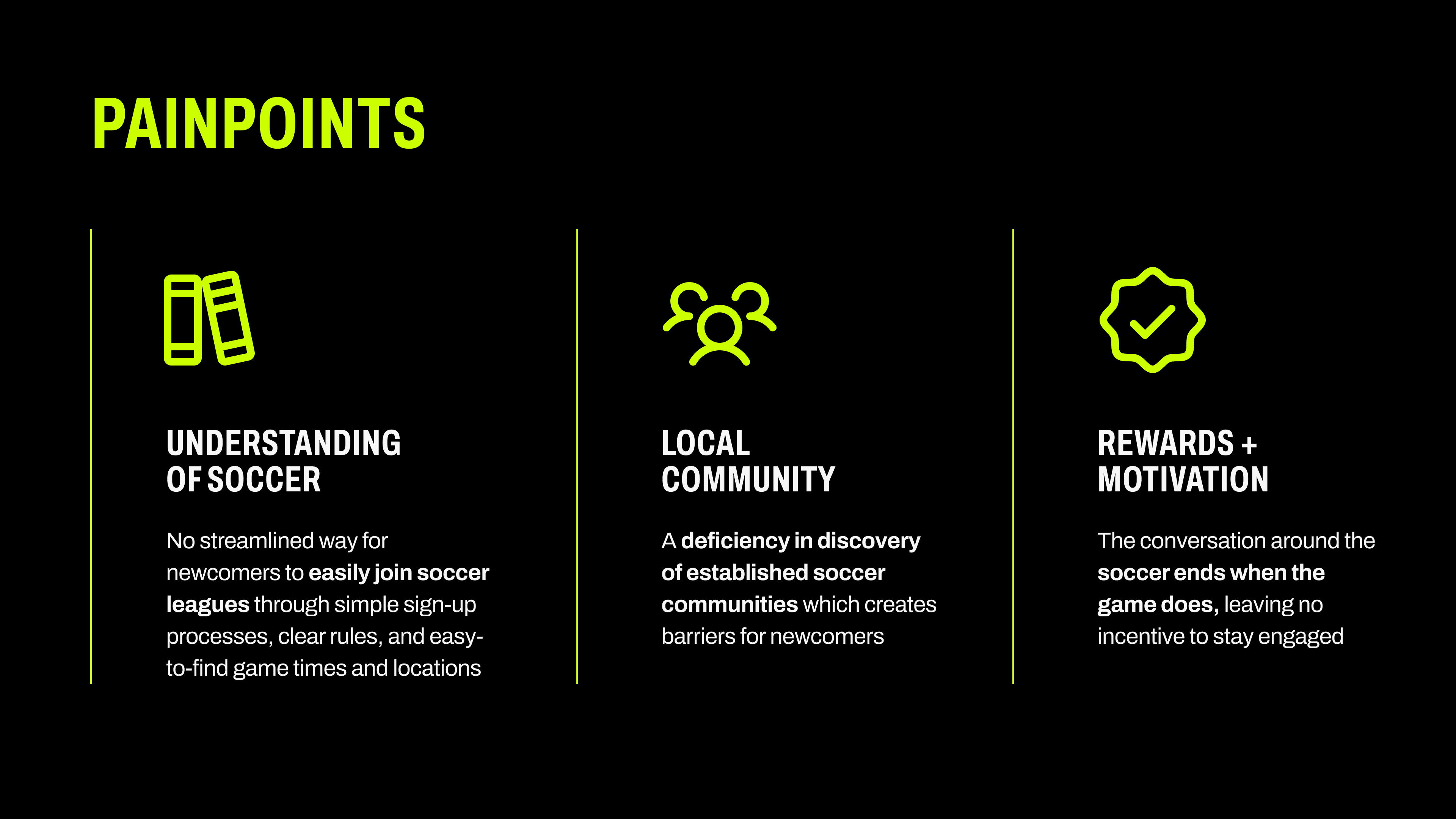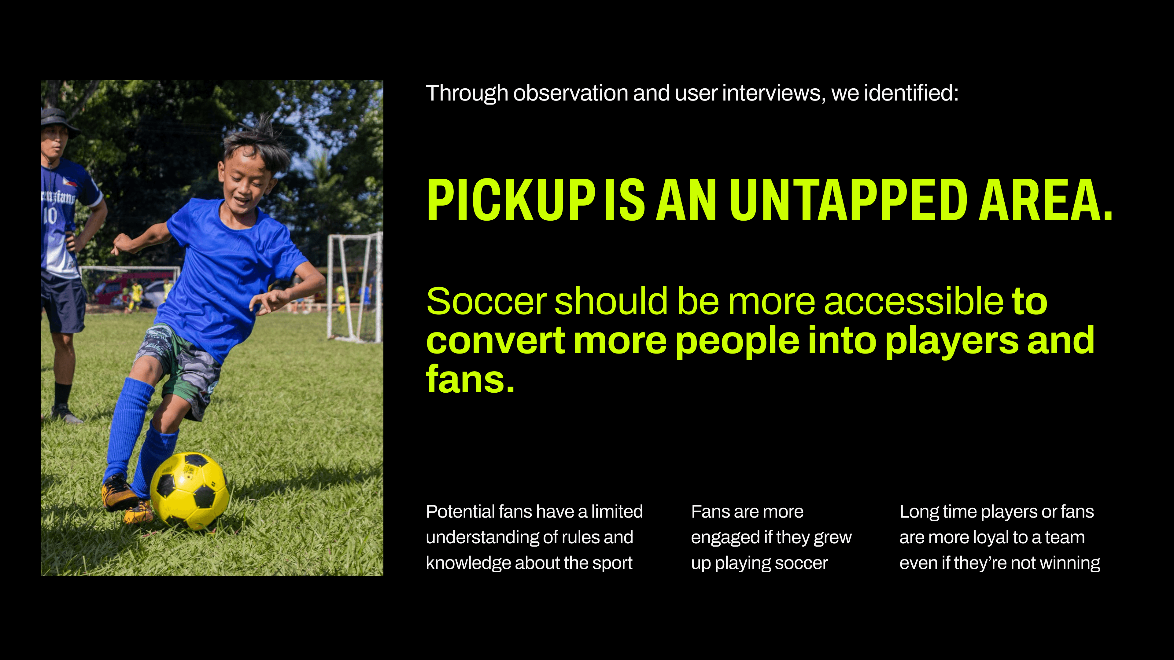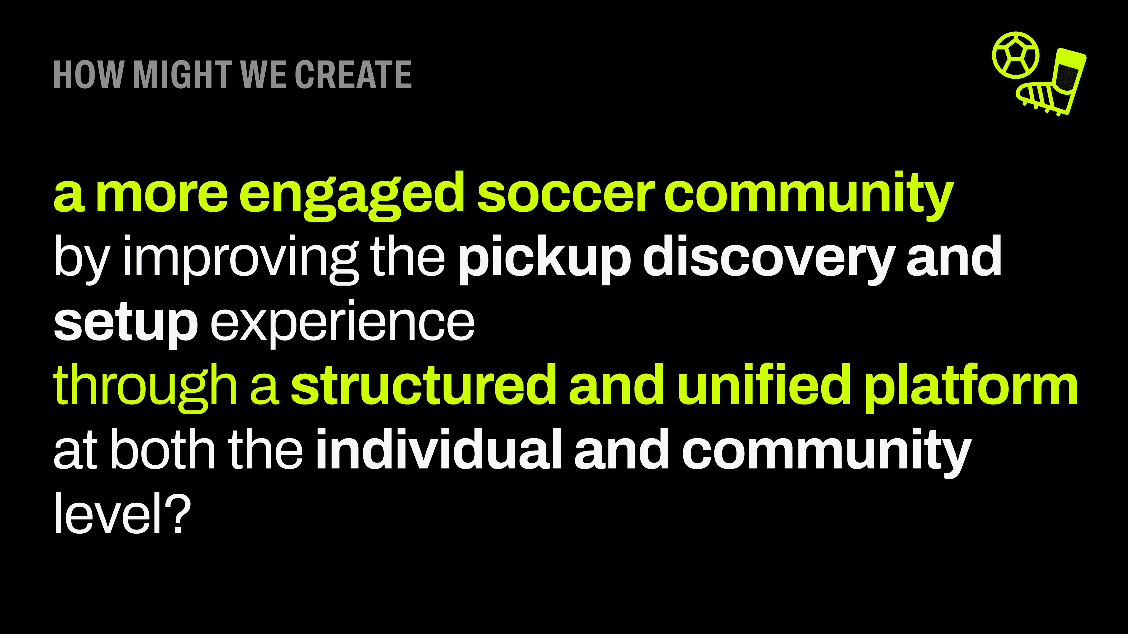 Our initial research highlighted three critical needs: streamlining the organization of pickup matches, creating a welcoming onboarding experience for new players, and reducing community fragmentation. To address this, we aimed to bridge the gap between local subcommunities and the global sport, fostering deeper connections across the U.S. Soccer fanbase.