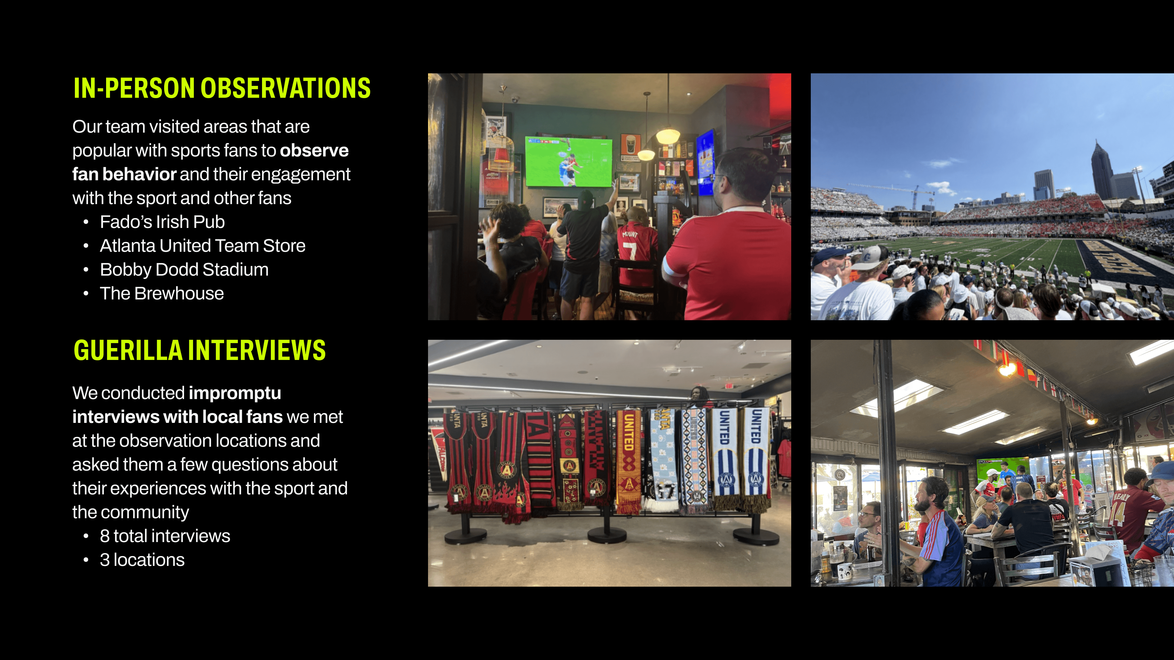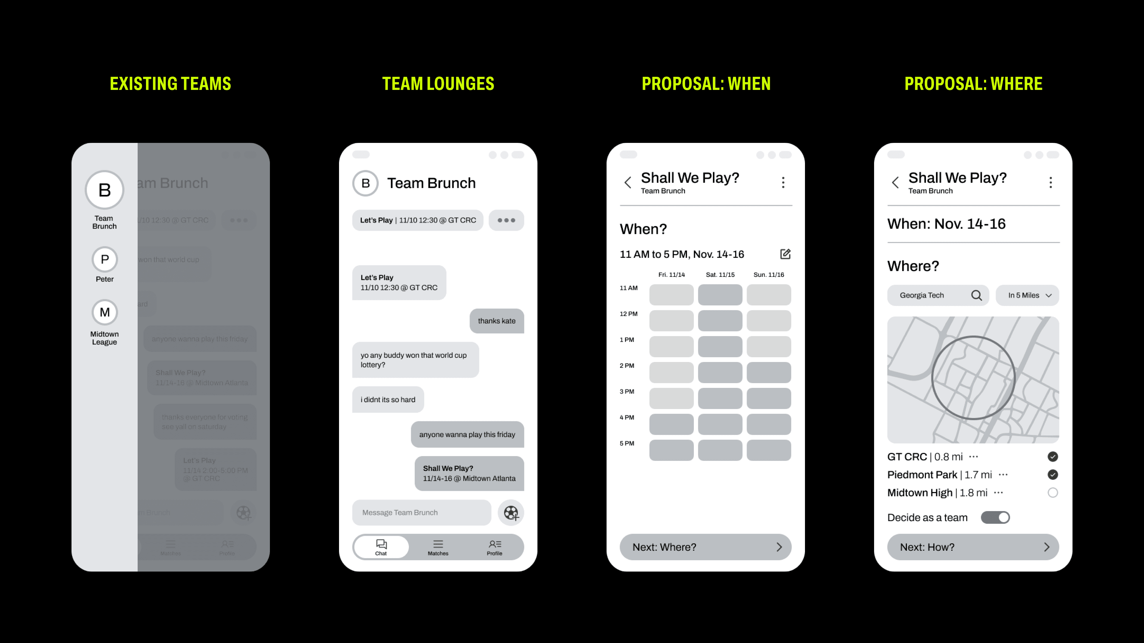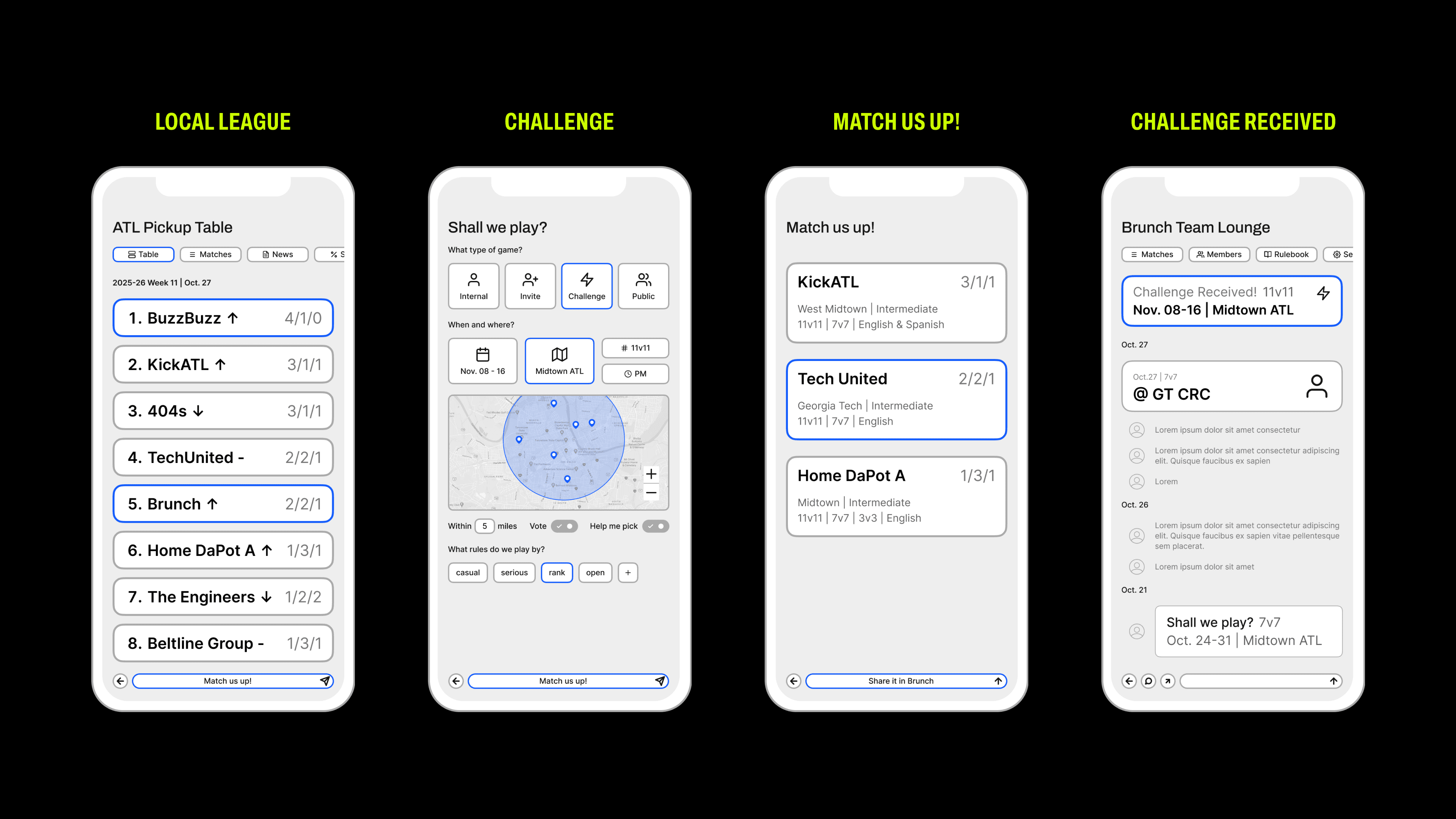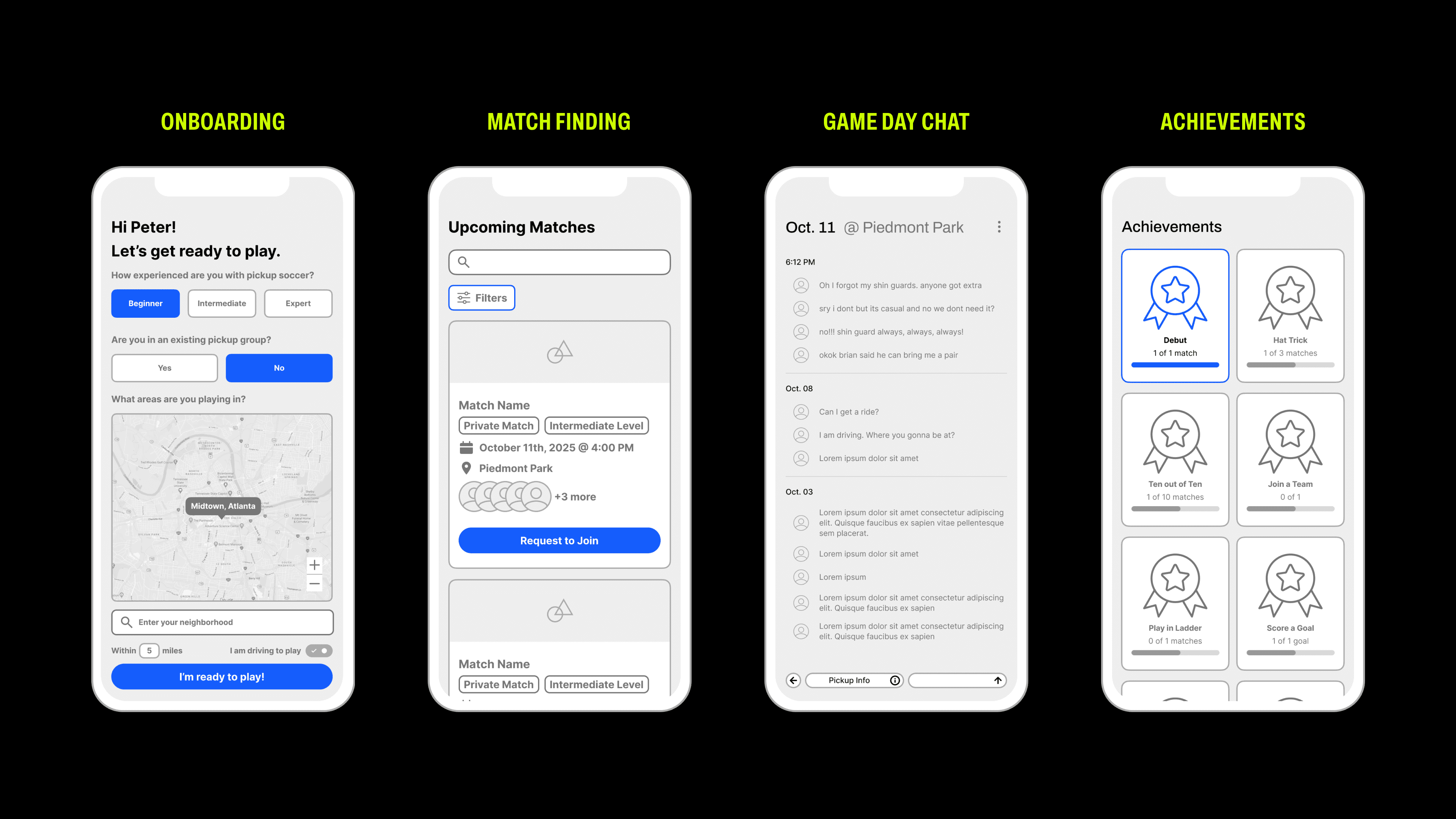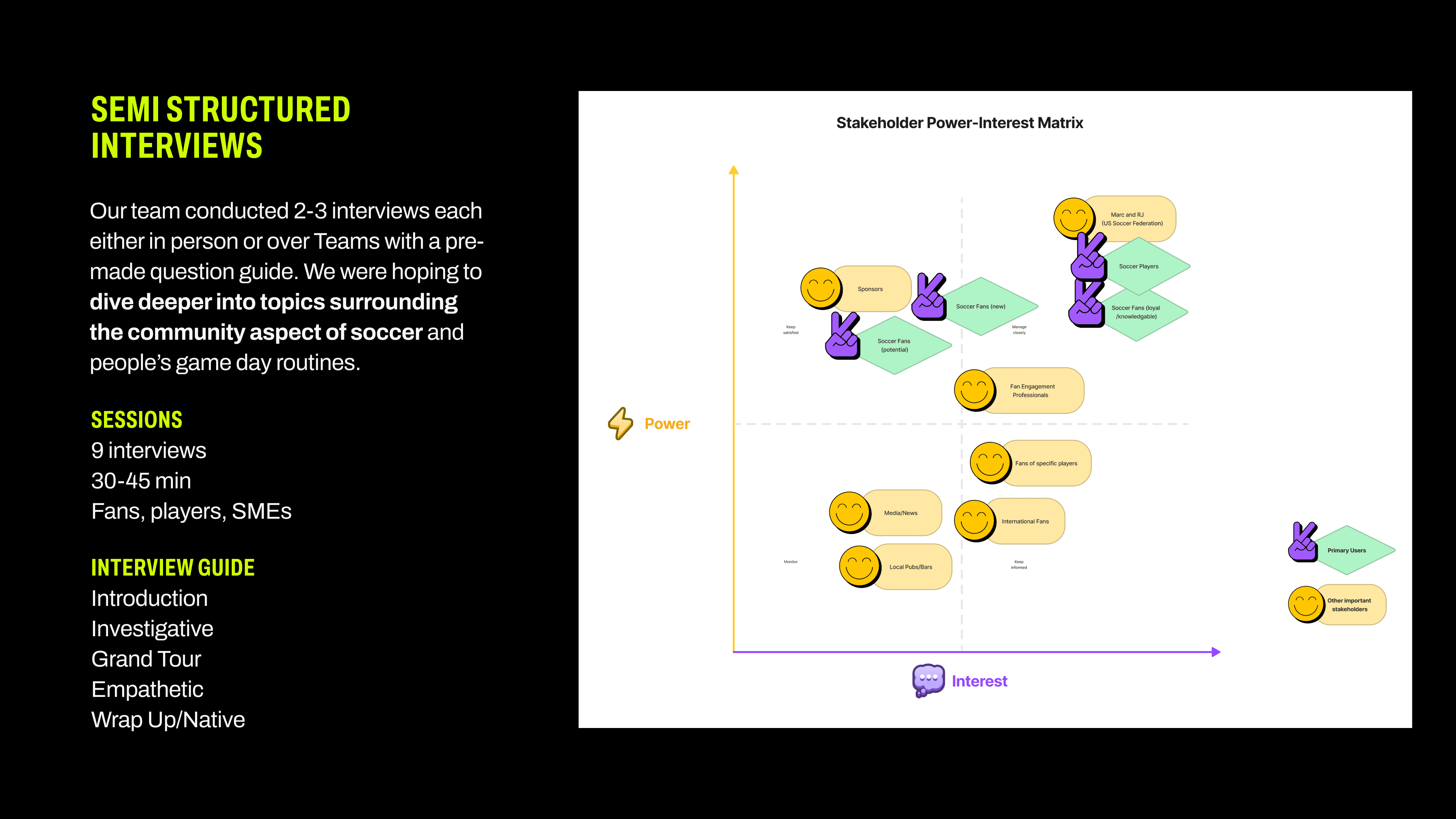 Our initial research highlighted three critical needs: streamlining the organization of pickup matches, creating a welcoming onboarding experience for new players, and reducing community fragmentation. To address this, we aimed to bridge the gap between local subcommunities and the global sport, fostering deeper connections across the U.S. Soccer fanbase.