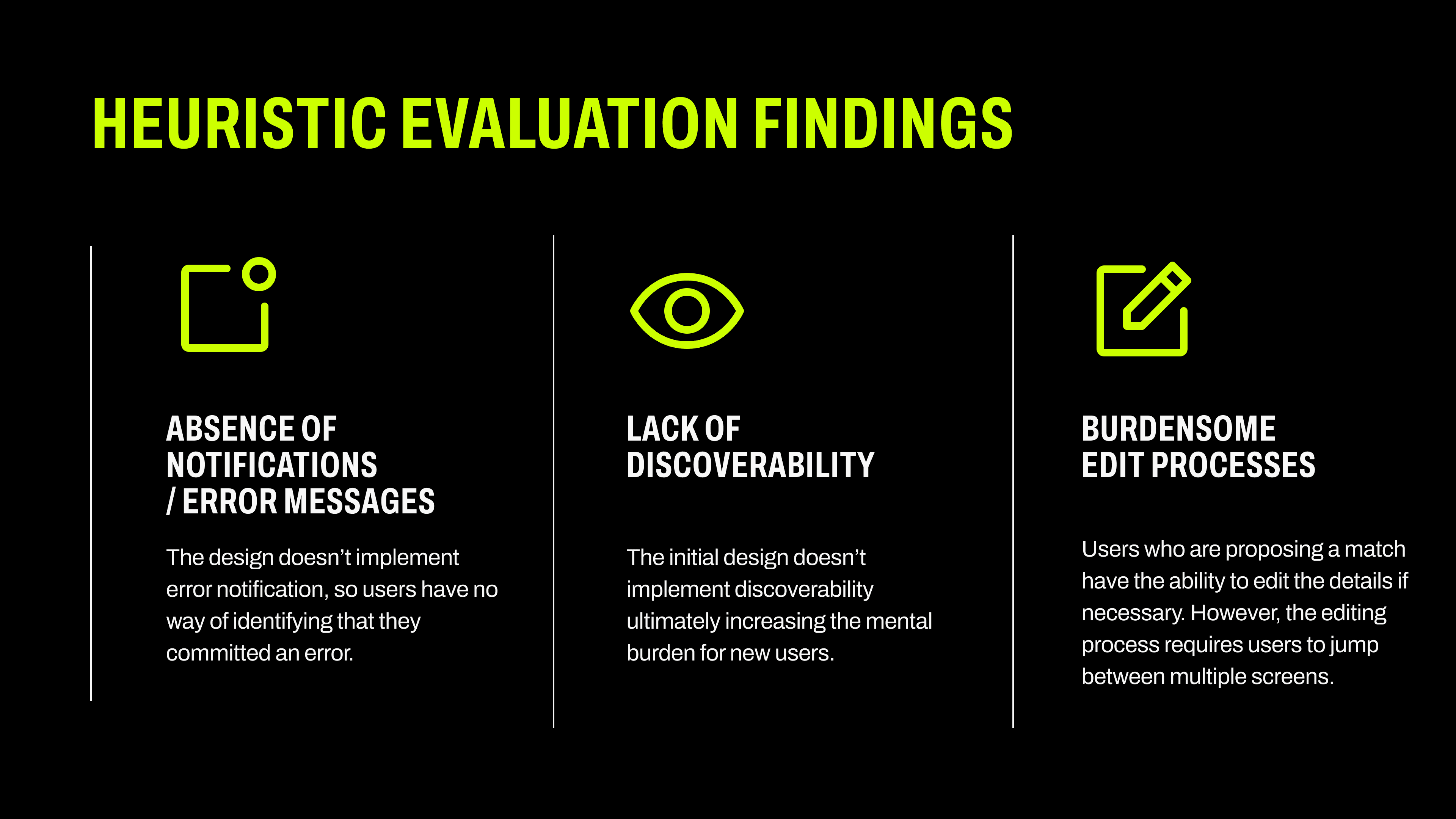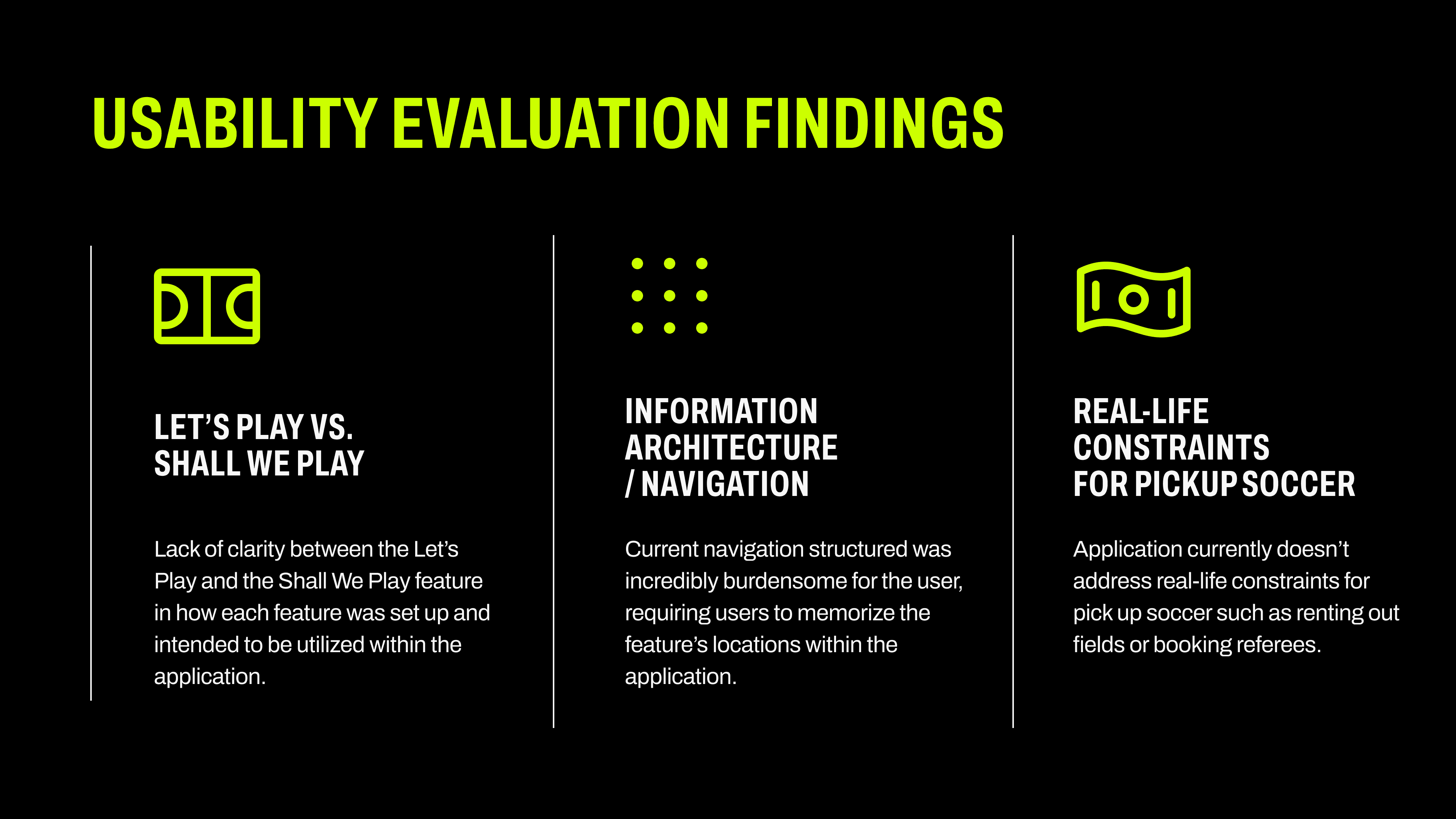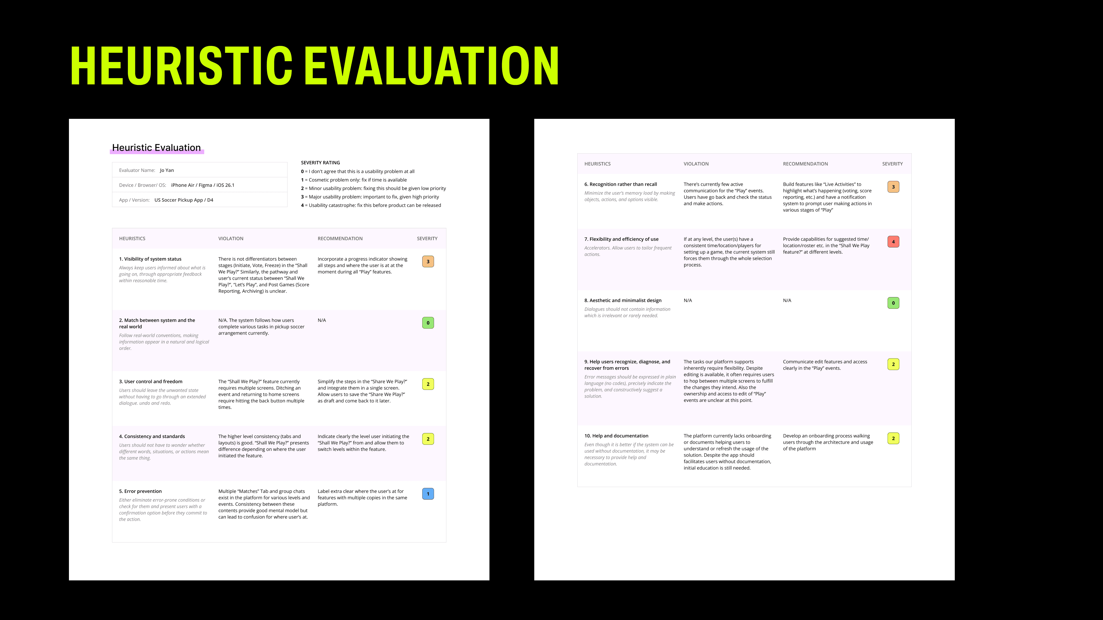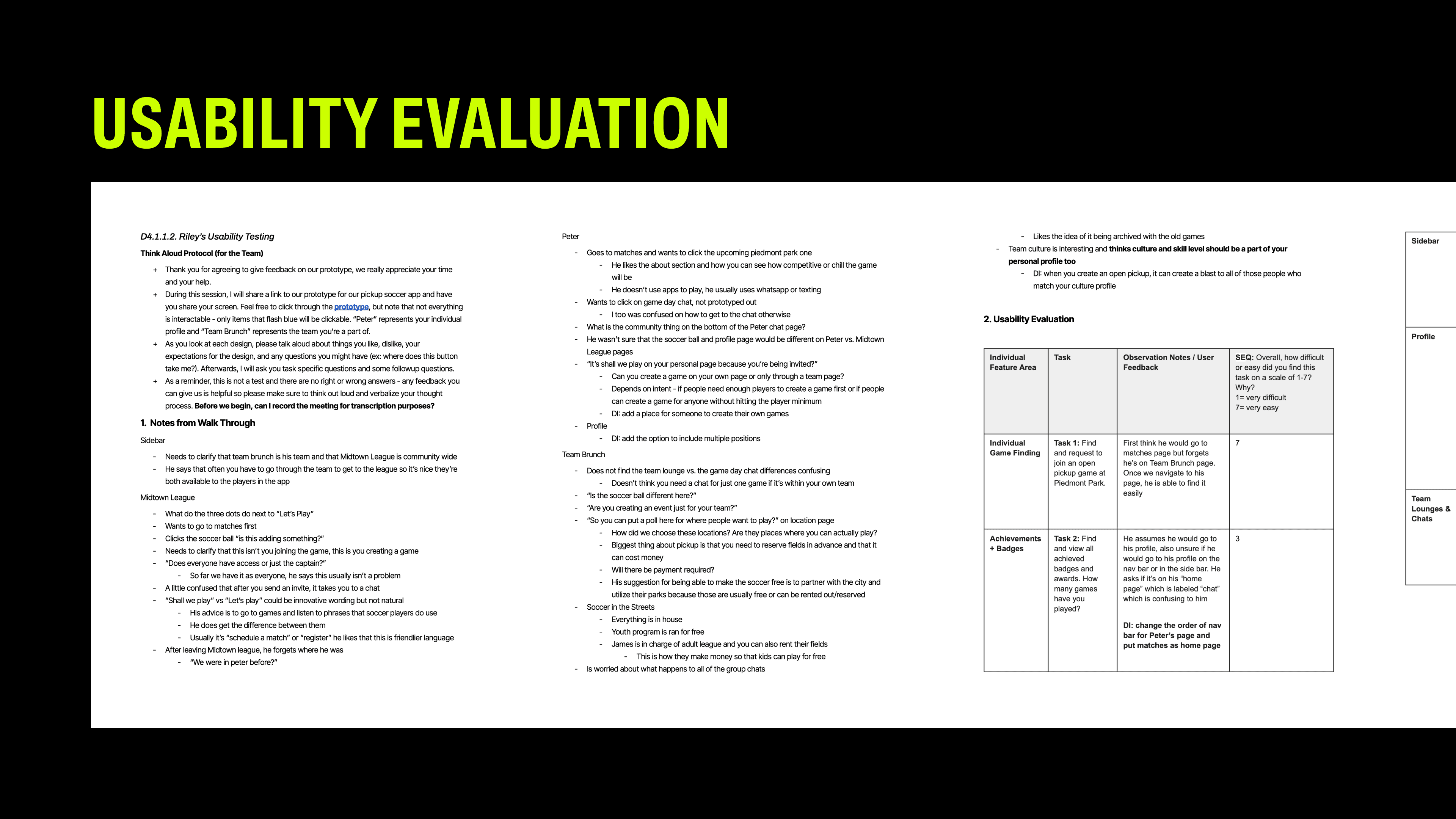 Usability Testing (Think Aloud): We validated our expert findings by conducting moderated testing with 4 active pickup soccer players. Utilizing the Think-Aloud Protocol, we asked users to verbalize their thought process while completing core tasks, such as proposing or finding a match.