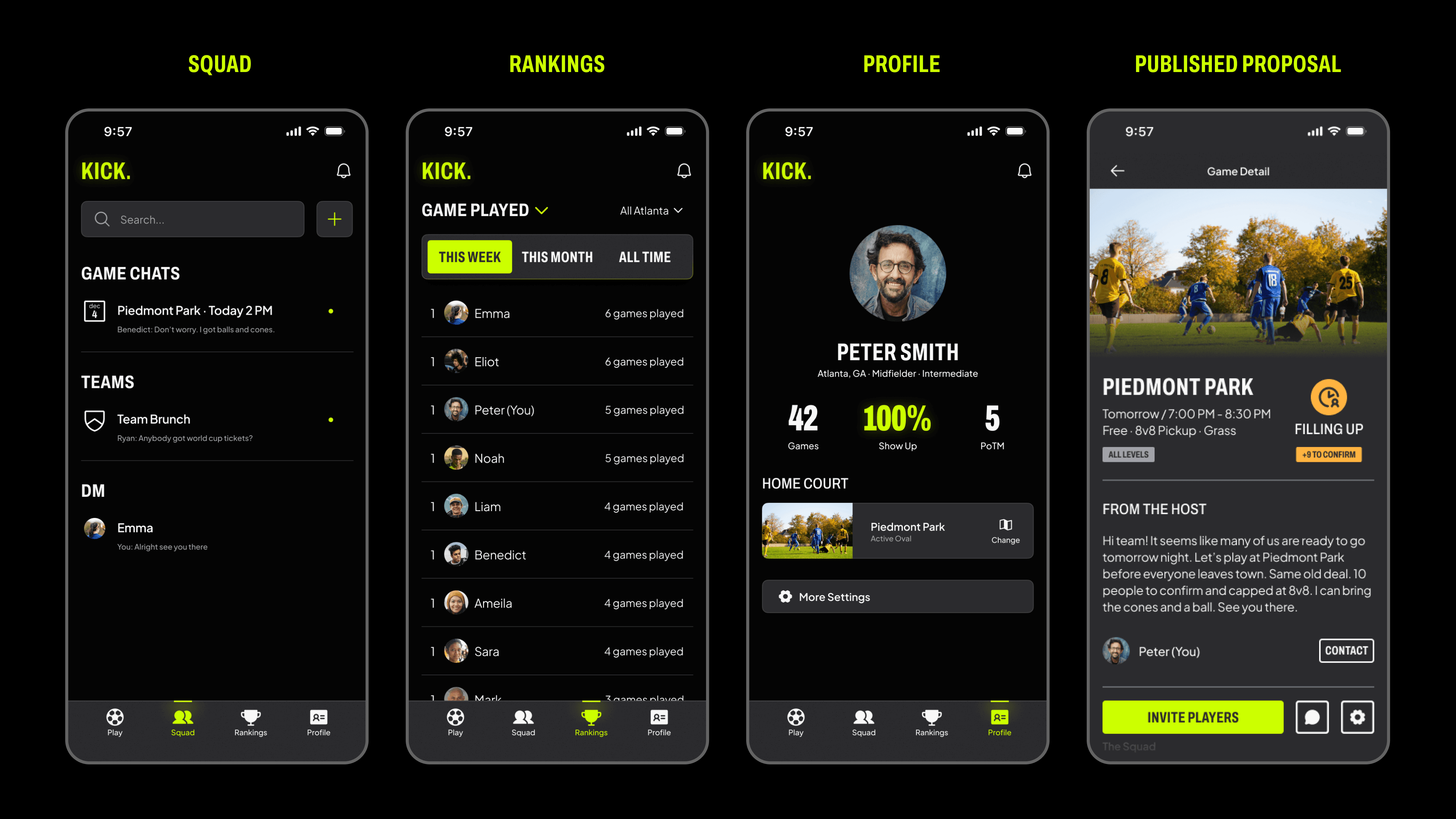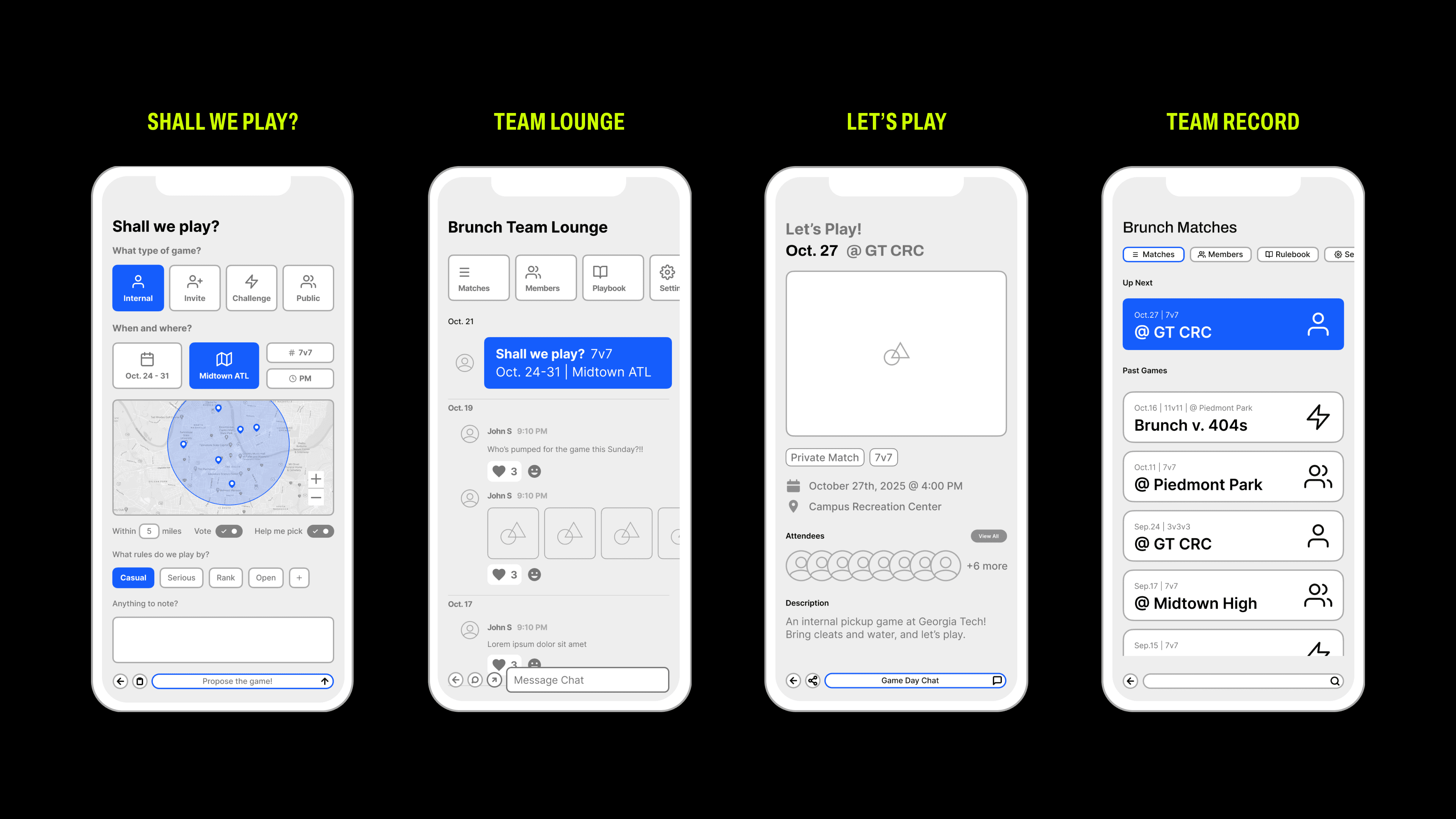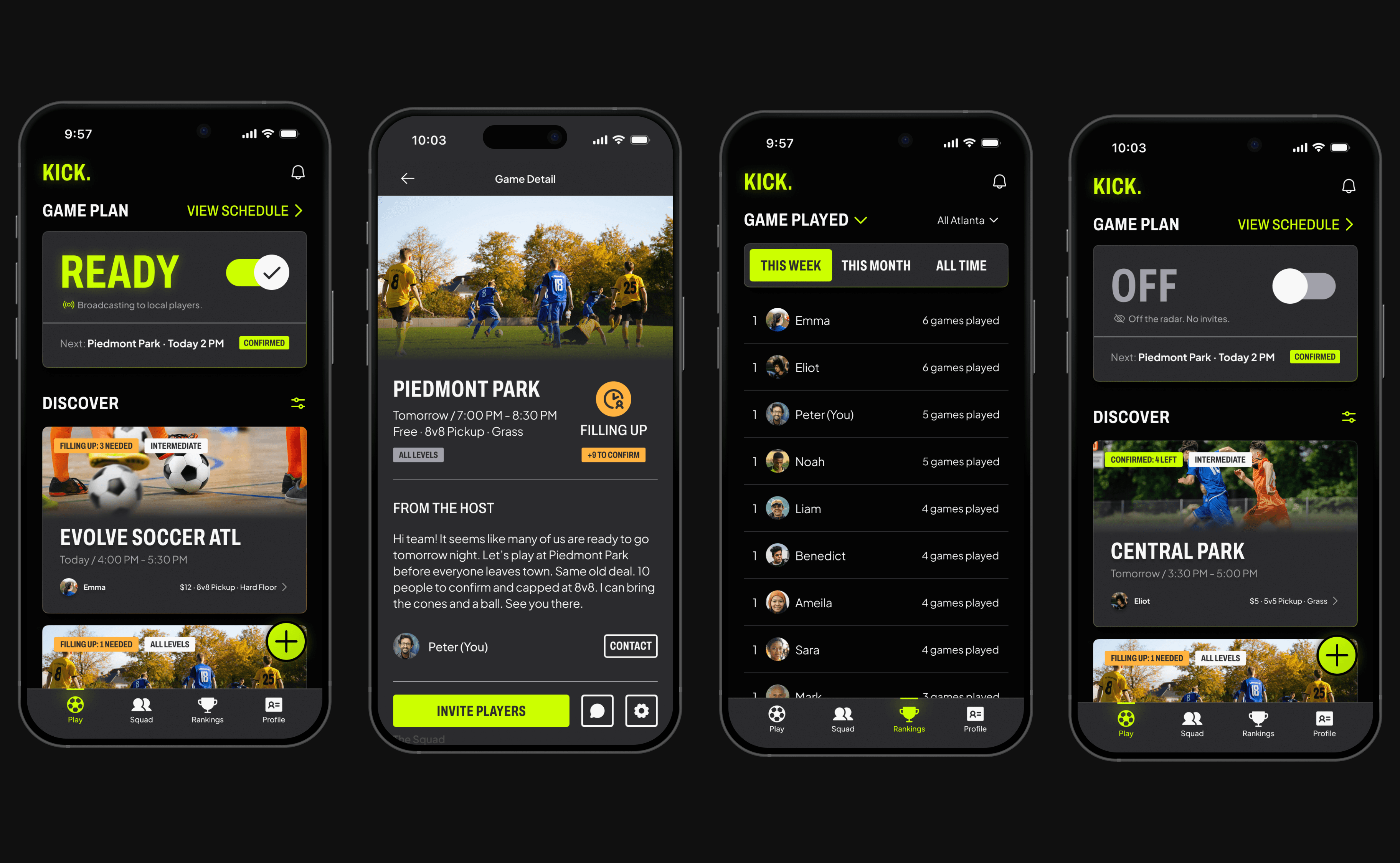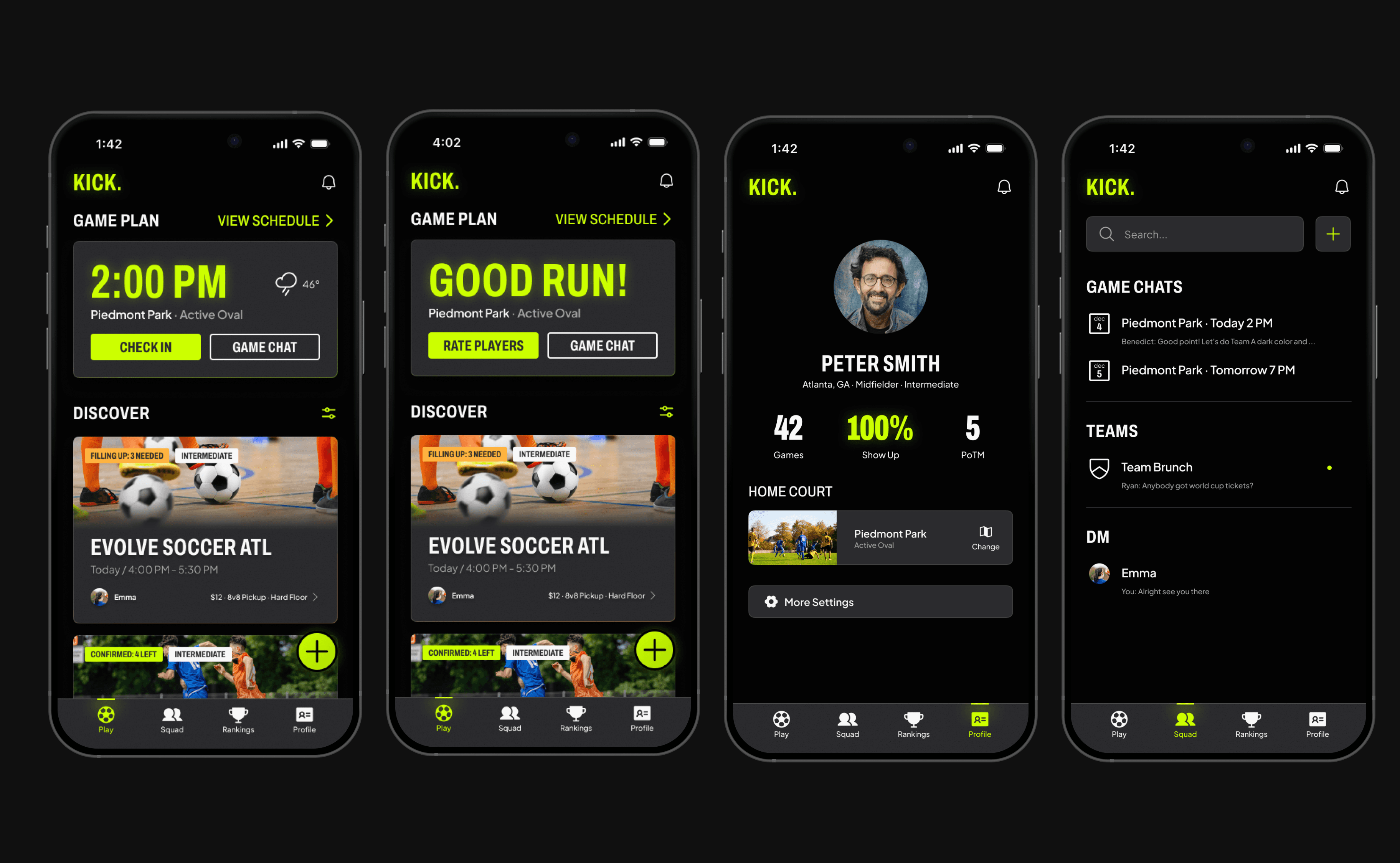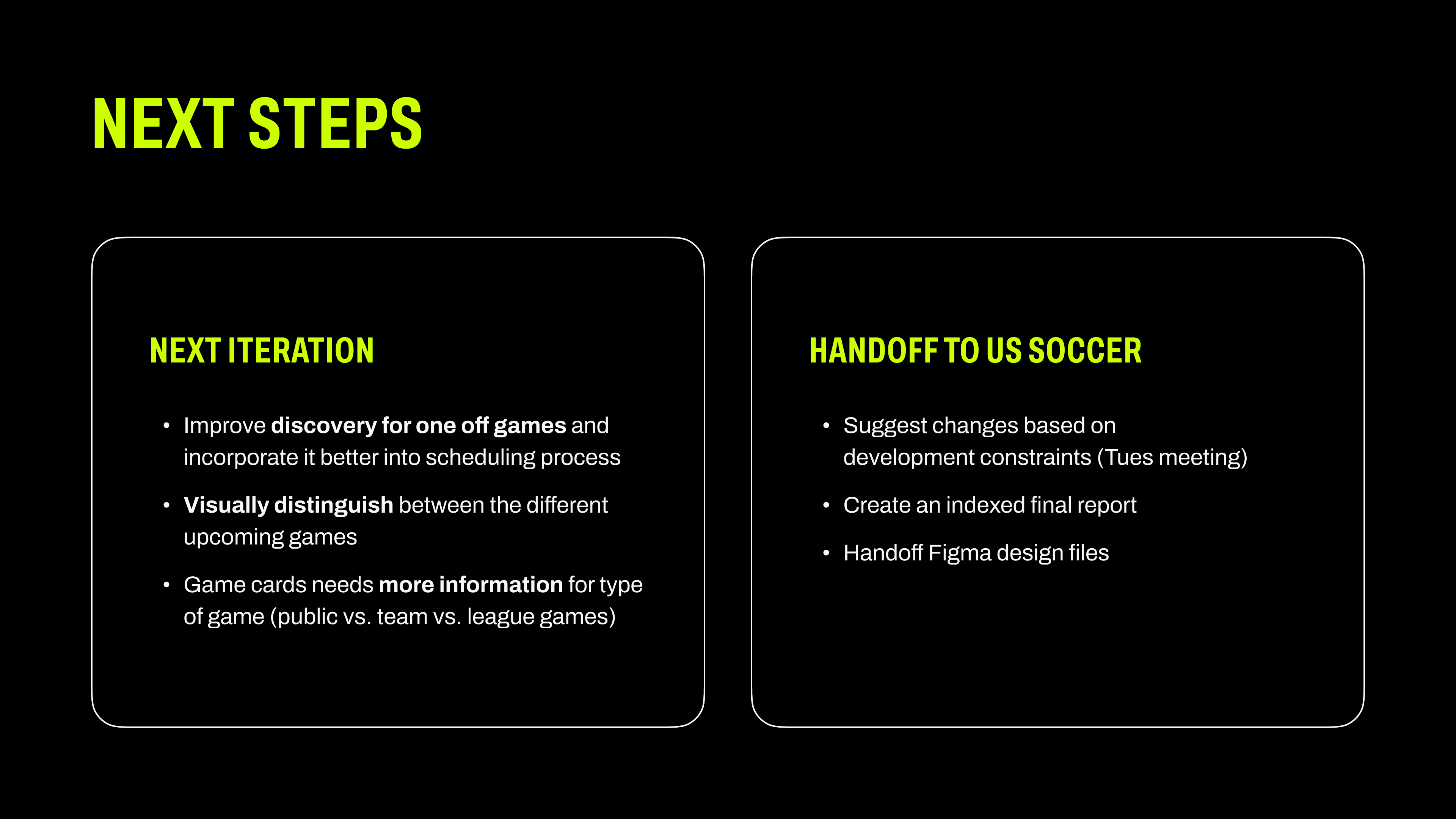 The project culminated in the handoff of a fully validated, high-fidelity prototype to our sponsor, the U.S. Soccer Federation. By synthesizing rigorous expert feedback and user testing, we delivered a polished design system that addresses the core logistics of the pickup experience, from discovery to game-day coordination. The result is more than just a scheduling tool; it is a digital hub designed to foster long-term player retention and build a stronger, more connected U.S. soccer community.