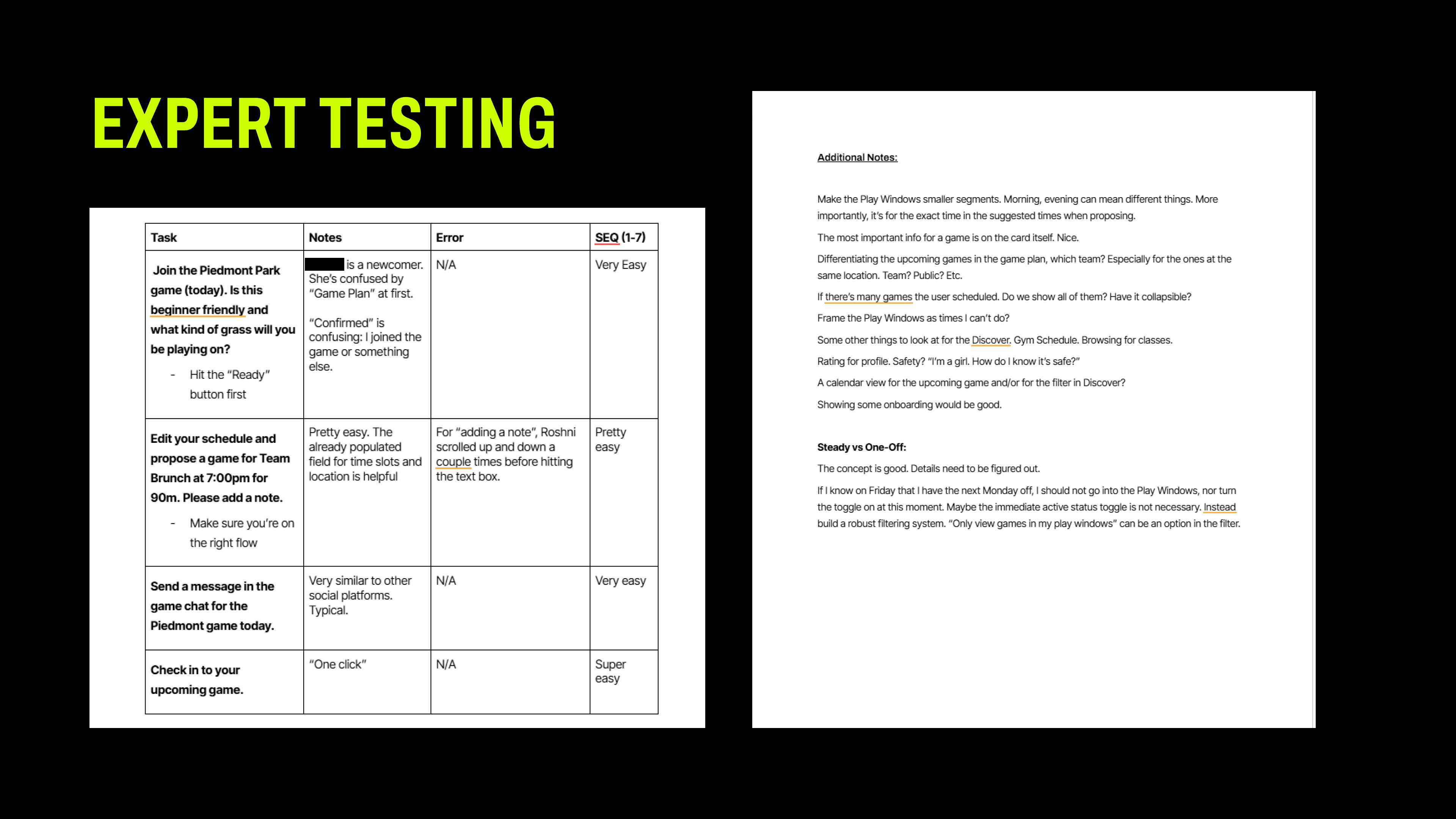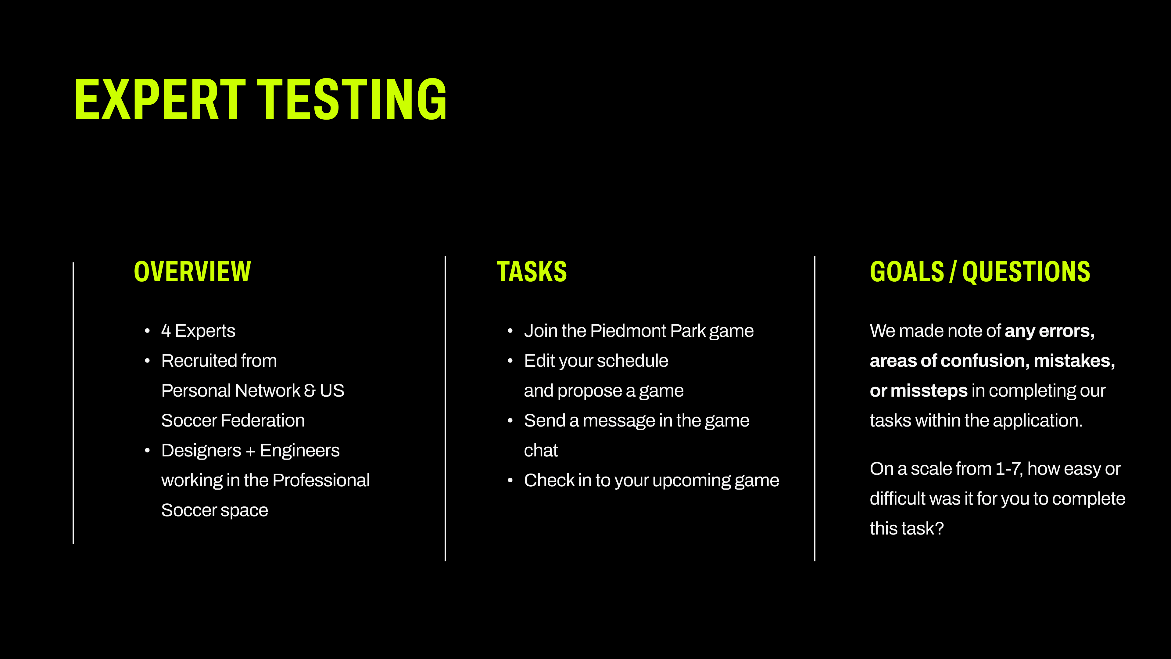 To validate our high-fidelity prototypes, we conducted an expert evaluation with four industry professionals, including designers and engineers recruited directly from the U.S. Soccer Federation. Participants were guided through four critical user journeys: joining a specific match at Piedmont Park, editing schedules to propose new games, utilizing the in-game chat, and performing a game check-in. Our primary goal was to identify usability friction by documenting errors, confusion, and missteps in real-time. We combined these qualitative observations with quantitative metrics by having experts rate the difficulty of each task using the Single Ease Question (SEQ) 7-point scale.